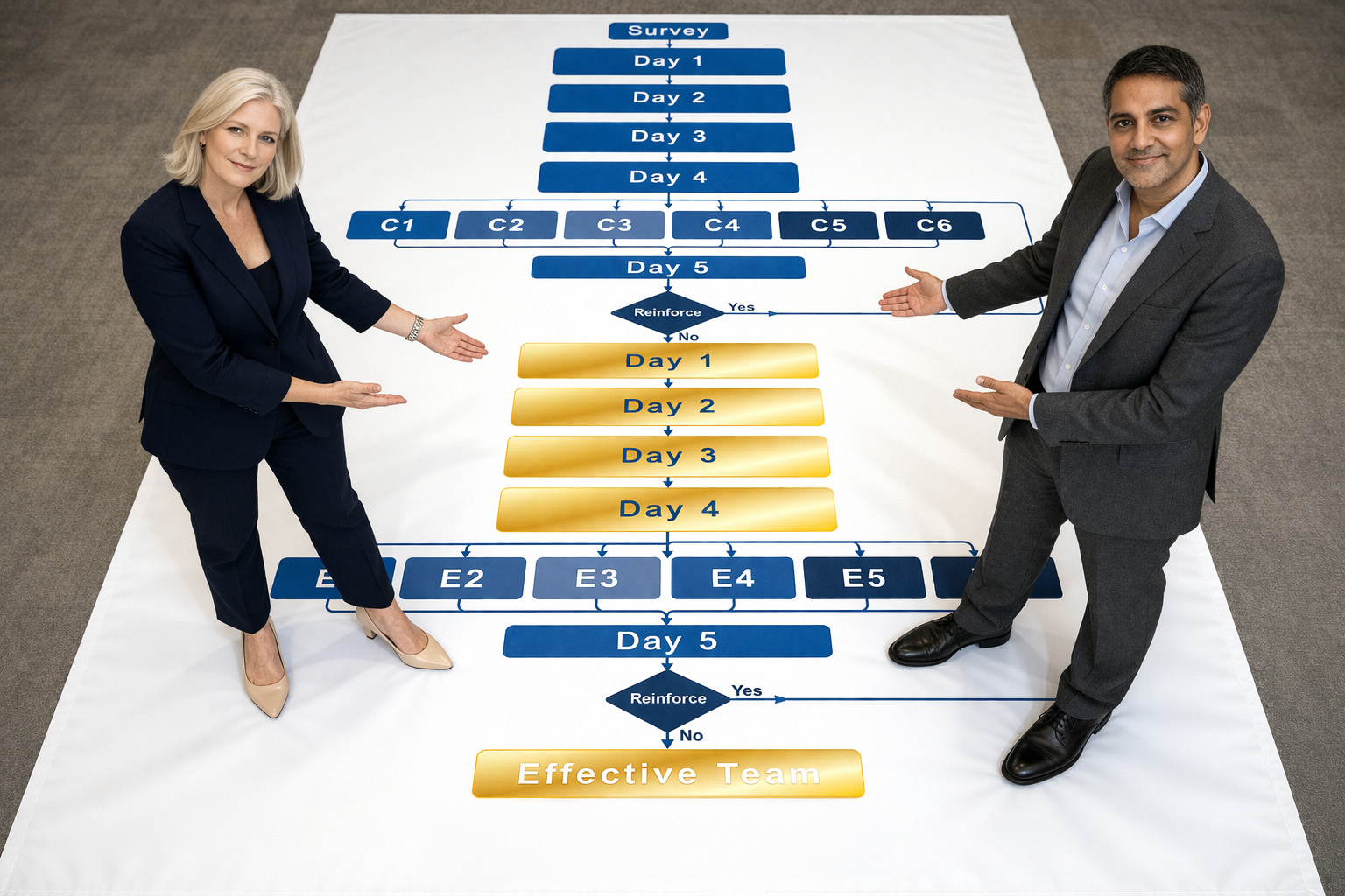 The methodology is built on over two decades of experience in understanding how teams perform in real environments. It combines structured thinking with experiential delivery, ensuring that insight is translated into practical change.